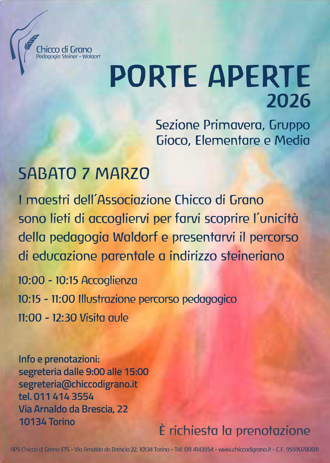 L’Associazione pedagogica Chicco di Grano, attiva sul territorio torinese, si occupa di istruzione parentale ed è impegnata da più di vent’anni a promuovere i principi della pedagogia Waldorf – Steiner e dell’Antroposofia.