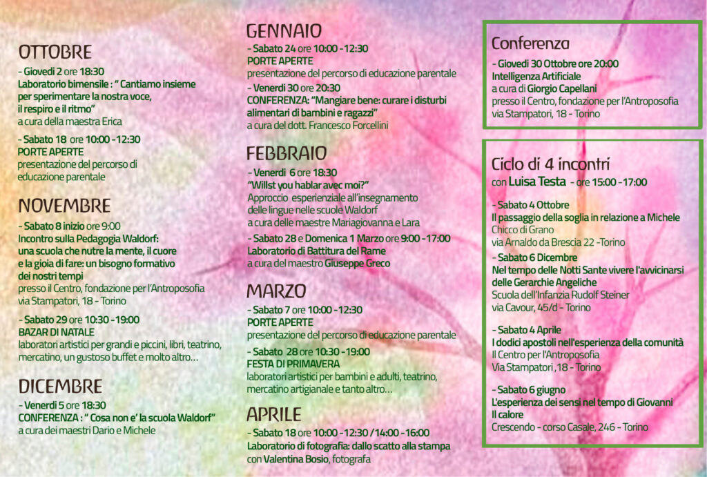 In questa sezione verranno condivisi gli eventi del Centro per l’Antroposofia e altre iniziative affini al movimento antroposofico attive sul territorio torinese.