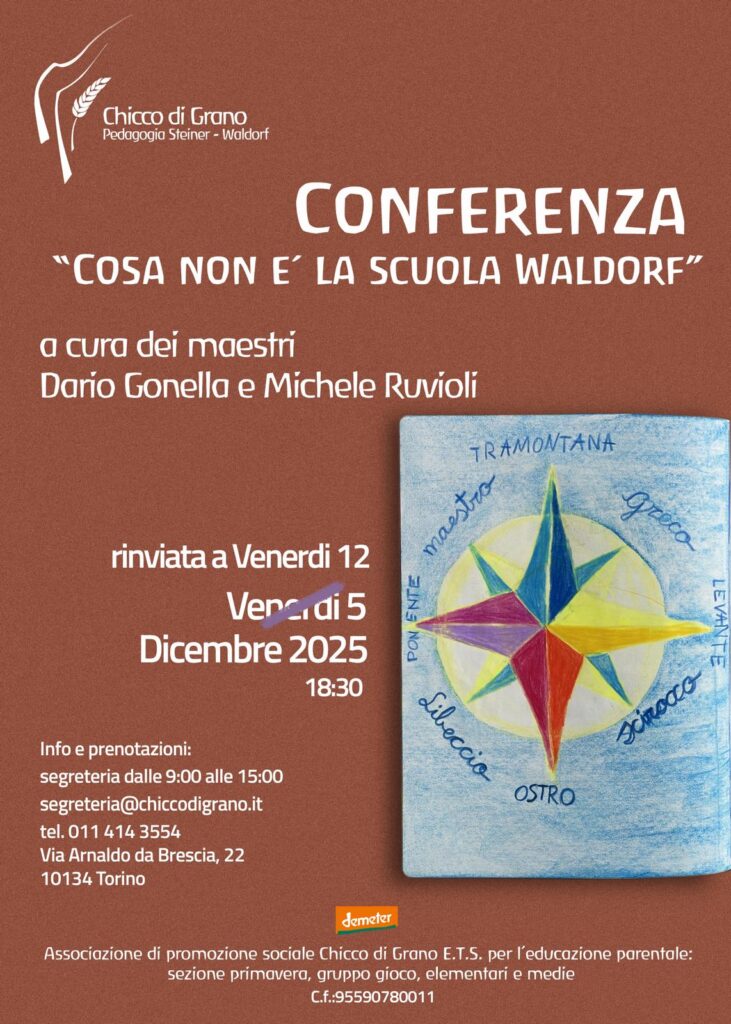 Una NON conferenza condotta dal nostro prezioso maestro Dario e dal simpatico maestro Michele dell’Associazione Crescendo, che con chiarezza, profondità ed un pizzico di umorismo affronteranno i tanti fraintendimenti che circondano la pedagogia steineriana: un’occasione per riflettere, chiarire e ritrovare il senso autentico dell’educazione come atto d’amore e libertà.