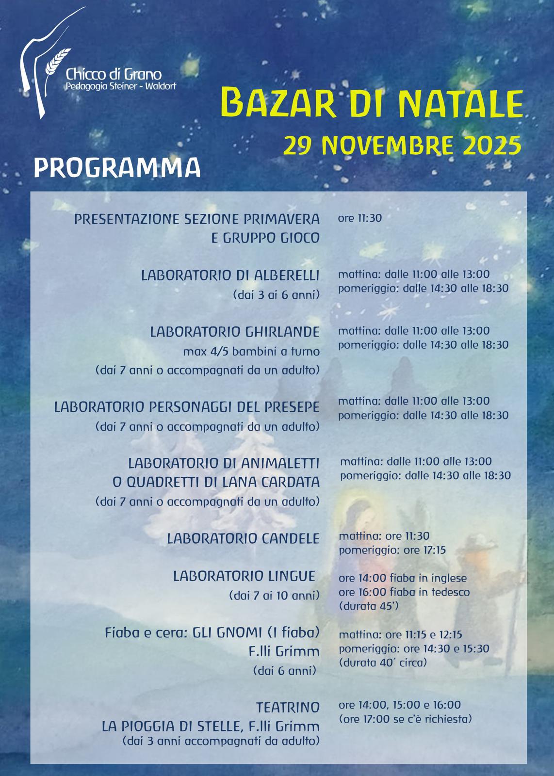 Durante la giornata troverete laboratori artistici ispirati e gioiosi, un teatrino che incanta, libri da scoprire, un mercatino ricco di creazioni artigianali e idee regalo e un buffet gustoso per condividere sapori e convivialità.